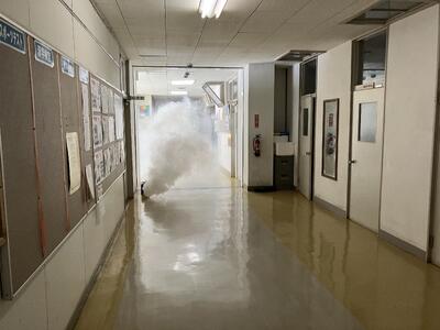 当日は一関消防署室根分署の菅原消防士長さんにもお越しいただき、実際に発煙させて実施しました。ほとんどの生徒は、口をハンカチや手でふさぎながら、低い姿勢で迅速に避難ができていました。講評の中で生徒に尋ねたところ、①放送を聞き、火元を避けた避難ルートをとった生徒が1/2、②友達・教職員から聞いて避難したのが1/3、③みんなが避難する方向について行ったのが若干名でした。菅原消防士長さんからは室中生は真剣に取り組み、素早く行動できており、大変すばらしかったとのお話をいただきました。